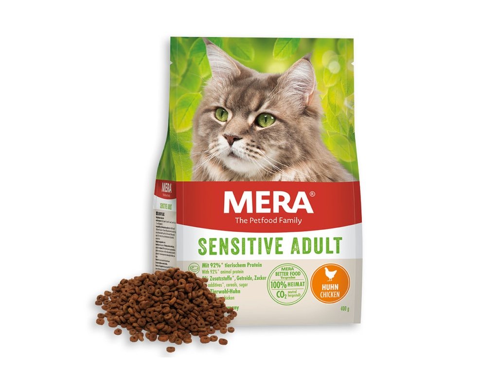 Mera CATS Sensitive Adult Huhn - pre dlhý a šťastný mačací život! Naše krmivo pre mačky sa vyrába udržateľným spôsobom a šetrne k životnému prostrediu v Nemecku. Ponúka nielen najvyššiu kvalitu, ale aj neodolateľnú chuť prostredníctvom rôznych tvarov a veľkostí krokiet, prispôsobených rôznym preferenciám a potrebám mačiek.