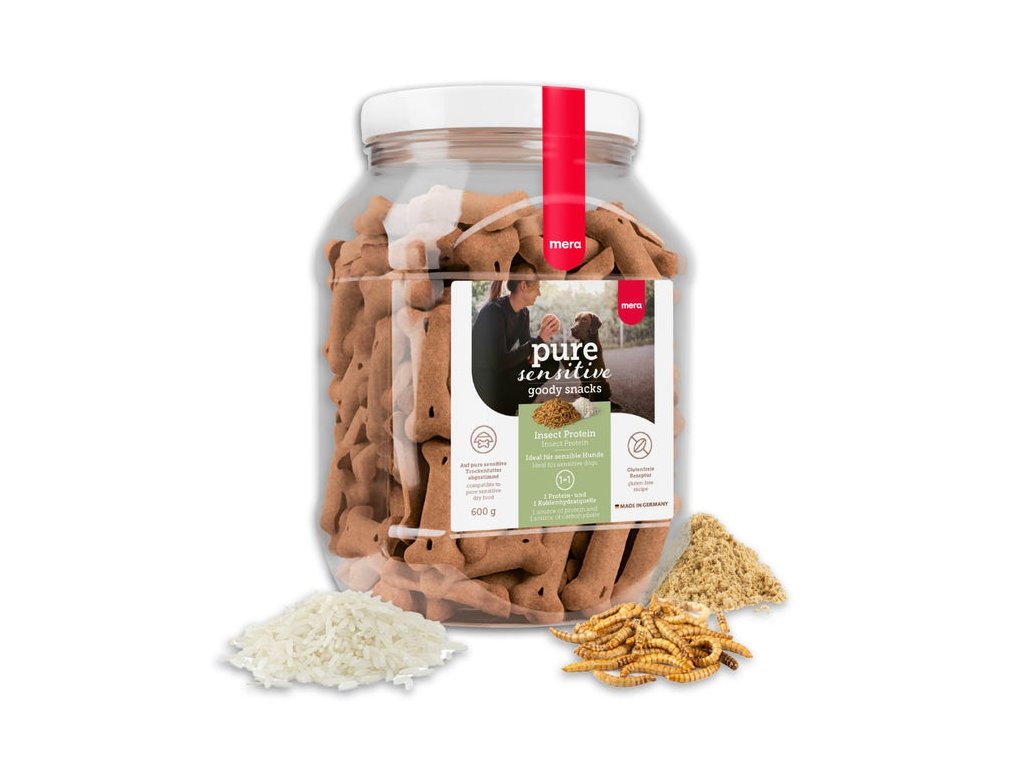 MERA Pure Sensitive Goody SnacksInsect ProteinZnížené riziko alergií a intolerancií vďaka jedinému zdroju proteínov a sacharidov✔ Ľahko stráviteľné a obzvlášť dobre tolerované ✔ LID - Limited Ingredient Diet (strava s obmedzením prísad) - minimalizuje riziko alergií |